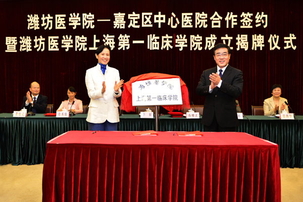 马安宁在讲话中对上海市嘉定区中心医院成为潍坊医学院上海第一临床学院表示热烈祝贺,并向多年来大力支持潍坊医学院发展的各级领导及医院干部职工表示衷心感谢。他向与会人员介绍了学校建设与发展的大好形势,指出设立上海第一临床学院,是学校贯彻落实新医学教育标准和卓越医生教育培养计划,切实提高临床教学质量,建设更多高水平临床教学基地的一次全新尝试,也将为培养更多合格医学人才搭建一个广阔平台。希望学校和医院以此为契机,进一步深化医学教育教学改革,严格教学管理和质量监控,不断提高教育教学质量,既促进医院“医教研”全面发展,又要为学校在改革开放的前沿阵地加强人才培养、促进学生就业打造厚实的平台,为国家医药卫生体制改革和培养高质量的医药卫生事业人才做出更大的贡献。