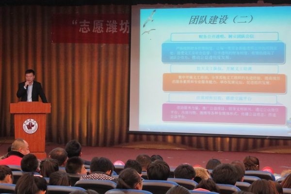 此次论坛的主题为探讨潍坊市高校青年志愿者团队发展现状及青年志愿者团队未来发展战略。山东省青年志愿者协会理事、潍坊市志愿者协会副秘书长孙志达在“志愿潍坊青年当先”主题讲座中就“如何创建优秀的志愿者服务人才团队”与志愿者代表们展开了讨论;之后论坛各成员进行了“打造优秀志愿人才团队、弘扬服务社会志愿精神”交流会、颐年园爱心志愿服务和“志在奉献、圆梦青年”主题晚会。