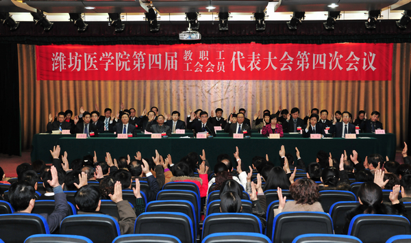 上午,第一次全体会议在浮烟山校区图书馆演播厅召开。校领导石增立、马安宁、秦玉明、张潍华、孙宏伟、朱军、井西学、葛国文和大会主席团其他成员在主席台就座。会议由大会主席团副主席、秘书长,校党委副书记张潍华主持。大会主席团副主席,校党委副书记、校长马安宁向大会作了题为《深化改革 加快发展 大力推进应用型人才培养特色名校建设》的工作报告。财务处处长王培承作了财务工作报告,总务处副处长赵世军对浮烟山校区绿化硬化规划设计方案进行了说明,提案工作委员会主任、学校办公室主任刘军作了提案办理情况报告。会议还提交了工会工作报告和工会经费审查工作报告。