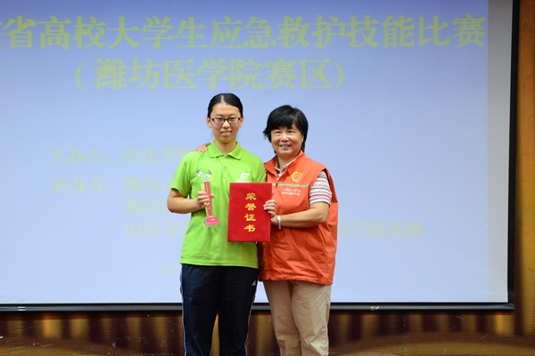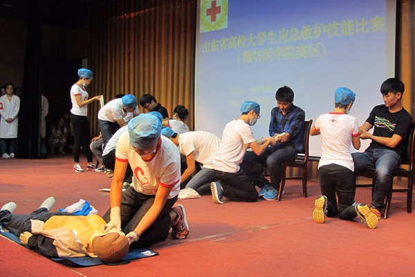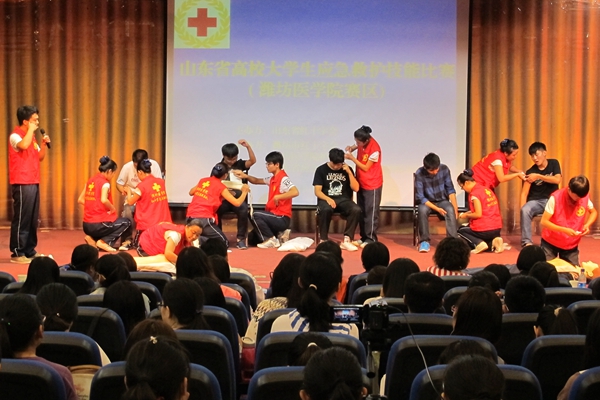 在第十五个世界急救日来临之际,9月15日上午,由山东省红十字会主办,beat365护理学院、山东省应急救护培训潍坊医学院基地、潍坊市红十字会承办的山东省高校大学生应急救护比赛(潍坊医学院赛区)在beat365图书馆演播厅举办。中国红十字会总会救护培训中心主任刘淑惠、山东省红十字会救护培训部部长谭延玲、潍坊市红十字会副会长张善绘参加活动。beat365党委副书记张潍华接见客人,护理学院相关负责同志参加。