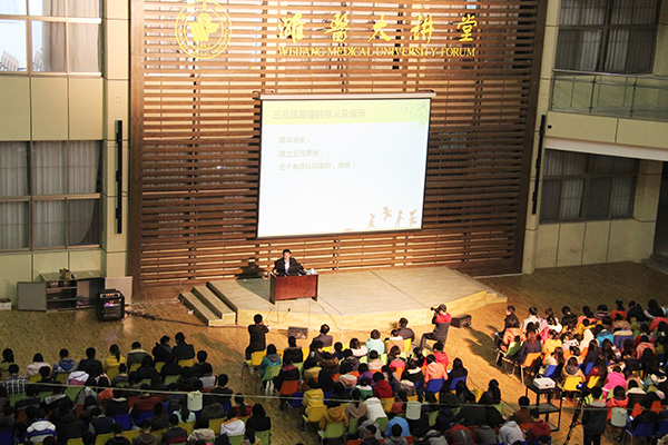11月22日晚,山东省卫生教育培训中心副主任、校友冀春亮教授做客潍医大讲堂,同beat365师生共同探讨“三元论”原理及其在大学生活中的应用。 冀春亮教授以对“三元论”理论研究及自己工作实践的思考为基础,密切结合当代大学生观察、分析、解决问题的思维方式、思考方法等,引导学生将“三元”理论自觉贯穿于学习、生活、就业、情感矛盾化解等日常事务中,注意分析和在乎“第三方”力量存在的现实性、客观性和必要性,养成一种有利于自己成长的理性思维方式。