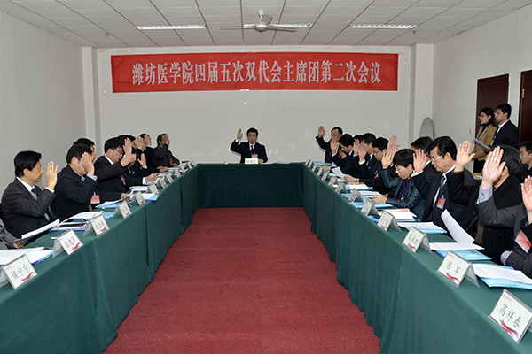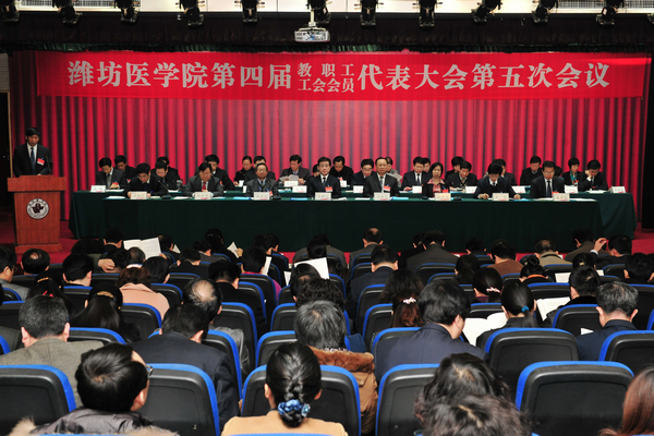 1月24日,潍坊医学院第四届教职工代表大会暨工会会员代表大会第五次会议隆重召开。会议听取、审议了关于校长工作报告、学校财务工作报告、工会工作报告和工会经费审查报告,并表决通过了报告的决议,会议讨论了《潍坊医学院章程(草案)》和《潍坊医学院关于加快推进应用型人才培养特色名校重点建设的意见(征求意见稿)》。