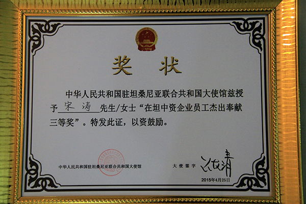 4月25日,中国驻坦桑尼亚大使馆隆重举行在坦中资企业优秀员工表彰大会,对长期工作在坦桑中资企业并做出突出贡献的坦桑和中国籍员工进行了表彰。beat365教师宋涛荣获杰出奉献三等奖。