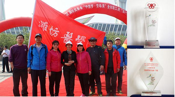 4月25日上午,第32届潍坊国际风筝会“中国梦·劳动美”全市职工庆“五一”群众风筝放飞活动仪式在市人民广场启动,对在潍坊国际风筝会放飞比赛中获奖的代表队进行了颁奖。beat365风筝代表队在本届比赛中技压群芳获得总成绩第一名,并获团体一等奖、优胜风筝放飞表演三等奖的好成绩。
