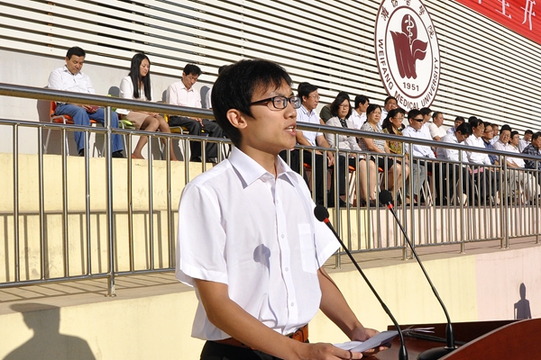 教师代表卢国华教授,新生代表、2015级临床医学专业张子翰, 2015级博士研究生沈郁淇,在校生代表、2014级硕士研究生张寒分别发言。