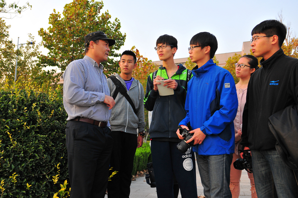 在讲座之前,丁老师在校园内指导同学们实景拍摄。