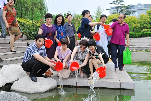 庆祝会后,校友们在美丽的浮烟山新校区合影;来到五年前捐赠的“溯源”石旁,种下了玉兰树,并镌刻了同学的名字;向智和湖投放了600余尾锦鲤鱼,向学校致意,向全校师生祝福。毕业30年聚会组委会还向全年级同学发出了捐资设立奖学金助学的倡议。