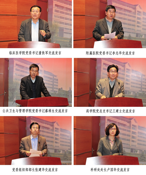 会议期间,参会人员围绕石增立在会议上所作人才工作报告和学校即将出台的人才工作相关文件进行了分组学习与讨论。临床医学院党委书记董铁军、附属医院党委书记李志华、公共卫生与管理学院党委书记蔡维生、药学院党总支书记王建立、党委组织部部长张建华、科研处处长卢国华等六位同志做了大会交流发言。