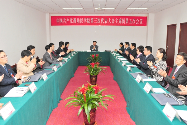4月13日上午,中国共产党潍坊医学院第三次代表大会主席团在图书馆121会议室举行第五次会议。李欣章同志主持会议。