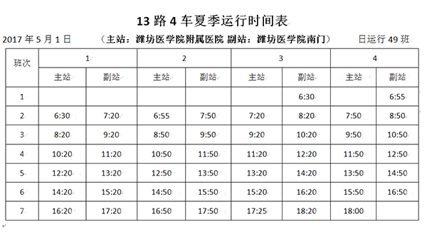 应学校师生要求,经校工会与潍坊市公交公司沟通协商,13路公交车自五5月1日起将延长运行时间,浮烟山校区末班车发车时间调整为18:20,附属医院末班车发车时间调整为18:00。
