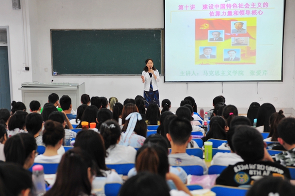 课堂上,张爱芹教授紧紧围绕建设中国特色社会主义根本目的这一主题,运用大量鲜活的案例,深入分析了建设中国特色社会主义,必须坚持一切为了人民,实现共同富裕,促进人的全面发展,让全体人民共享改革发展的成果,让人民群众有更多获得感。课堂讲授的全国优秀县委书记廖俊波的先进事迹及我国发展的新成就,深深打动了在场听课学生。