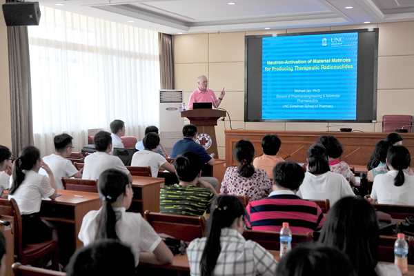 会后,Michael Jay教授应邀做了“Neutron-Activation of Material Matrices for Producing Therapeutic Radionuclides”的学术报告。药学院师生100余人参加了报告会。其间,两位专家还与药学院教师进行了座谈交流。