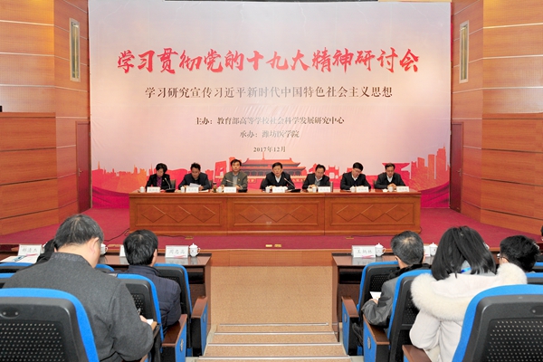 为深入学习贯彻党的十九大精神,积极推进习近平新时代中国特色社会主义思想的研究宣传工作,12月9日,由教育部高等学校社会科学发展研究中心主办,beat365承办的“学习贯彻党的十九大精神研讨会”在潍坊举行。教育部高等学校社会科学发展研究中心主任、博士生导师王炳林教授,山东省社科联党组副书记、副主席周忠高教授,齐鲁师范学院院长林松柏教授,东北师范大学马克思主义学部部长、博士生导师庞立生教授,《中共中央党校学报》副主编、博士生导师刘学侠教授,beat365党委书记李欣章,校党委副书记张潍华出席开幕式。张潍华主持开幕式。副校长刘军主持闭幕式。