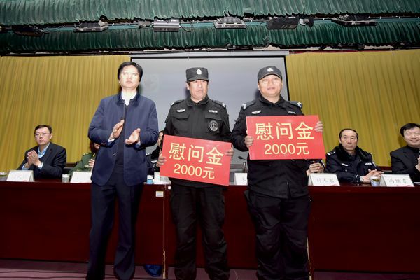 朱军对全体安保人员提出了总体要求:一是做到新起点、新服务、高标准、严要求;二是做到主动融入潍医,以主人翁意识服务学校;三是加强学习,不断提升素质和能力。会上,朱军代表学校为安保服务中表现突出的邵建祥、刘祯昌两名队员发放慰问金。刘术君对保安公司和即将入驻校园的全体保安人员提出了“服务好学校,打造高校安保服务标杆”的具体要求。闫凯朋代表公司作了表态发言。