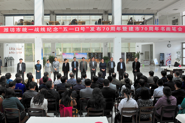 上午9时,全市统一战线纪念“五一口号”发布70周年暨建市70周年书画笔会活动在图书馆二楼举行,共有来自全市7个民主党派的20余名书画界代表参加活动,以丹青回顾历史,以笔墨抒展情怀。