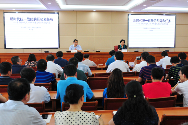 学习会上,邱永文教授作了题为《新时代统一战线的形势和任务》的专题辅导。邱教授结合党的十八大以来统一战线事业的创新发展,着重对当前统一战线工作中的重大理论和实践问题两个方面的内容,分别从新时代统一战线的科学内涵、新发展和形势任务进行了详细的阐述。辅导报告对广大领导干部学习贯彻落实习近平新时代中国特色社会主义思想和党的十九大精神,深入了解和把握新时代统一战线的形势和任务,做好新时代学校统战工作以及民族宗教工作,促进学校新时代统一战线事业发展具有重要指导作用。