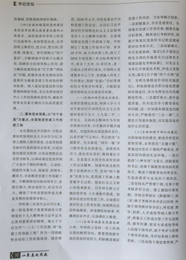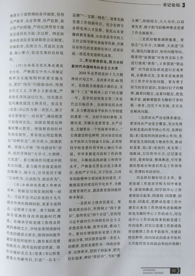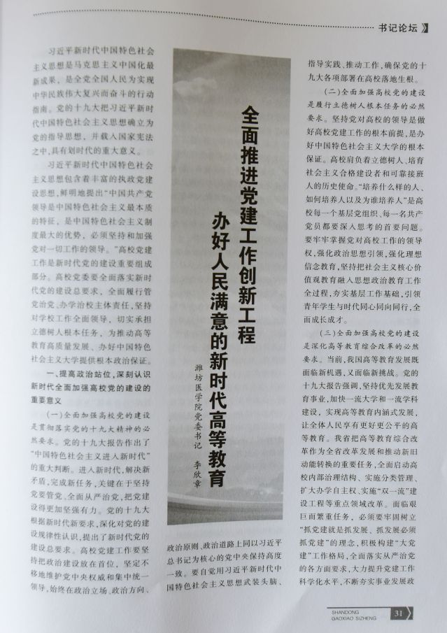 中共山东省委教育工委主办的《山东高校思政》期刊,2018年第4期封面报道并在“书记论坛”栏目中刊发了beat365党委书记李欣章署名文章:《全面推进党建工作创新工程 办好人民满意的新时代高等教育》。文章指出,要提高政治站位,深刻认识新时代全面加强高校党的建设的重要意义;聚焦固本强基,以“五个全面”为重点,全面推进党建工作创新工程;牢记使命担当,努力办好新时代中国特色社会主义大学。
