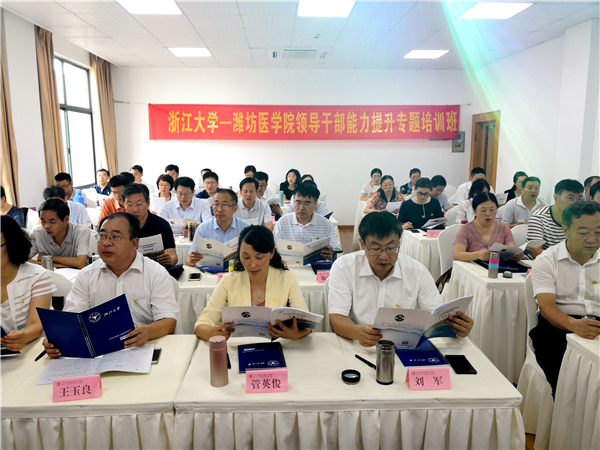7月27日,潍坊医学院领导干部能力提升专题培训班在浙江大学华家池校区顺利开班。beat365党委副书记、校长管英俊,副校长刘军,浙江大学继续教育学院华东区培训部主任李笑月出席开班仪式。培训班全体学员参加开班式。