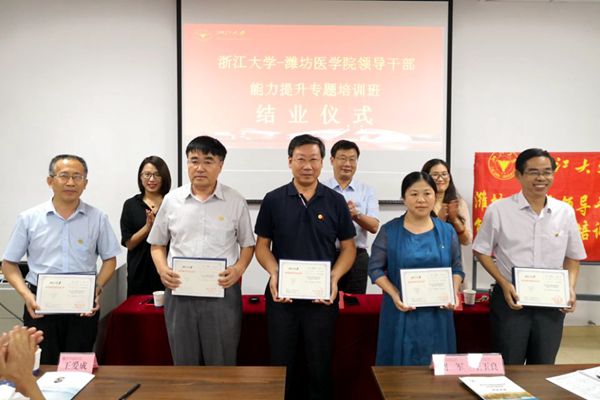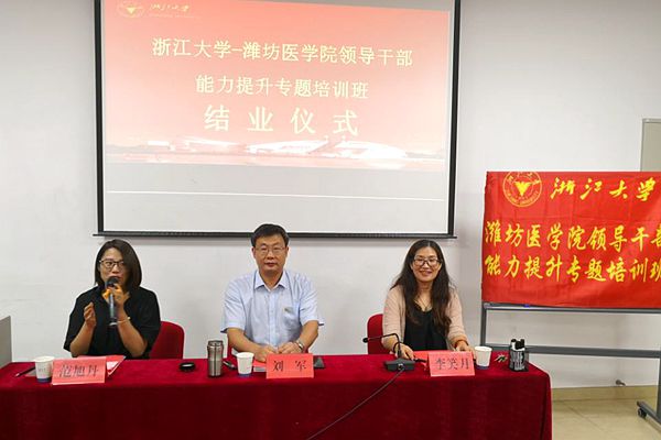 李笑月致结业辞。她指出培训期间,学员们遵守纪律,课堂效果好,代表了潍坊医学院领导干部的良好形象。希望全体学员把学到的知识运用到工作中,把在浙江大学的所思、所感、所悟、所想分享给潍坊医学院的师生,也希望通过这次培训,进一步加强两校之间的交流合作。