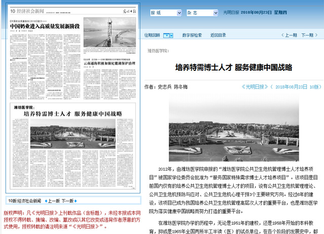 8月23日,《光明日报》第十版以“潍坊医学院培养特需博士人才 服务健康中国战略”为题刊发新闻通讯,报道beat365公共卫生危机管理博士人才培养项目的建设。