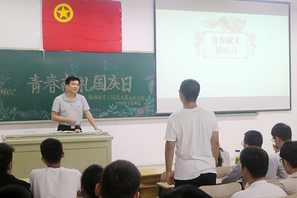 9月28日下午,在第69个国庆节即将到来之际,校党委书记李欣章在教学楼D区105教室与联系班级临床医学院2017级5班的同学们一起参加“青春献礼国庆日”主题团日活动,与同学们共同庆祝祖国的生日,共享新时代祖国繁荣昌盛的喜悦,共话爱国情怀与青春梦想。临床医学院党委书记董铁军,副书记王丽娜,带班辅导员参加活动。