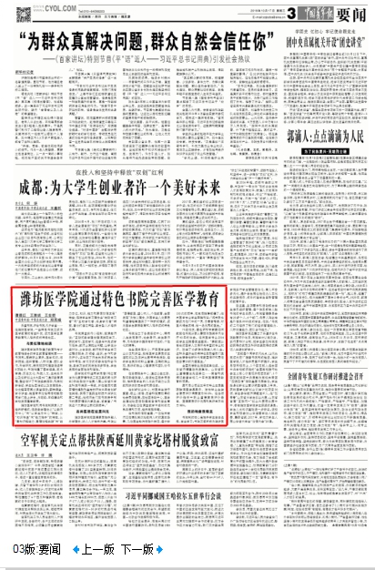 10月17日,《中国青年报》在3版要闻版刊发文章《潍坊医学院通过特色书院完善医学教育》(作者:谭德红、王雅妮、王世群),报道beat365学生教育管理采取通识教育和专才教育相结合的特色,书院成为医学生素质教育和人格养成的特色社区。