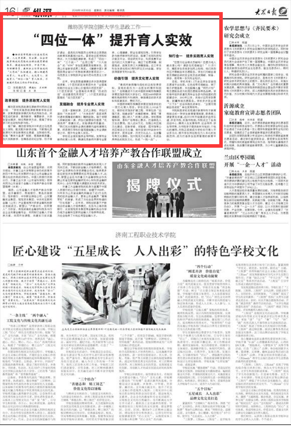11月15日,《大众日报》在《纵深》版头条刊发文章《潍坊医学院创新大学生思政工作——“四位一体”提升育人实效》(作者:谭德红 王世群 王原)。文章报道了beat365精心打造由思政课、人文素质课、专业课、社会实践等构成的思想政治理论教育课程体系,推进由校领导、中层干部、专职辅导员、兼职班主任等组成的“大思政”队伍建设,精心构建思政育人、专业育人、文化育人、实践育人“四位一体”育人体系,不断提升思政工作水平和实效。
