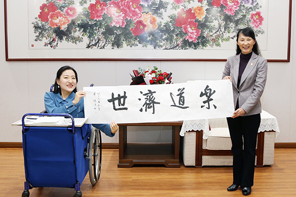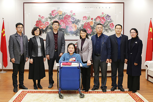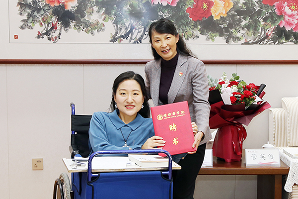 11月20日下午,潍坊市残联副理事长、中国书法家协会会员、“最美轮椅姐姐”刘晓清来校交流报告。校长管英俊亲切接见并颁发客座教授聘书,党委办公室、学生工作处、校团委、人事处、科研处等部门负责人参加座谈交流。