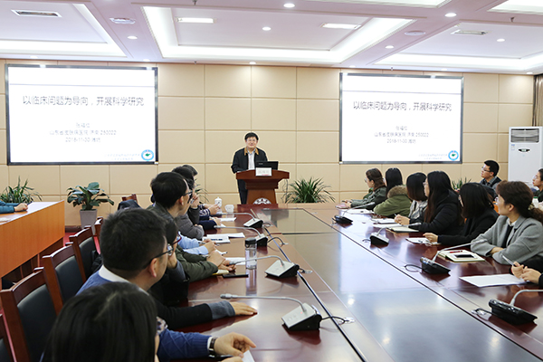 聘任仪式结束后,张福仁教授做了题为《以临床问题为导向,开展科学研究》的精彩讲座。刘军主持讲座。张教授结合自己丰富的临床经验,详细介绍了临床问题导向的科学研究战略:从临床工作中发现问题,通过科学研究去解答问题,科学研究中的成果通过临床实践进一步验证,从而不断地提高临床诊疗水平。张教授临床经验丰富、科研思路清晰、语言生动风趣,与会师生纷纷表示深受启迪,受益匪浅。