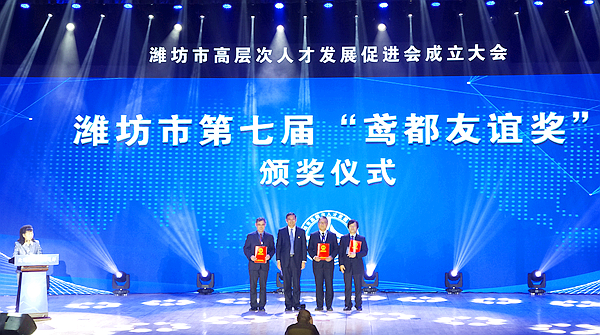 本次会议由潍坊市人民政府主办,驻潍坊院校、聘请外国专家的企业等近40所单位参评。经过重重选拔,10家涉外企业获奖,beat365脱颖而出成为唯一获奖的院校。此奖项是对beat365高端人才聘请、外国专家服务工作和外国专家管理成绩的肯定。