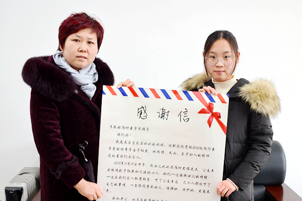 12月7日下午,昌乐女孩小娇(化名)的母亲专程赶往学校赠送感谢信,感谢beat365公共卫生与管理学院预防医学专业2015级学生于红燕爱心助人、不计回报的高尚行为。公共卫生与管理学院党委书记董惠平带领于红燕一起接待了小娇的母亲。