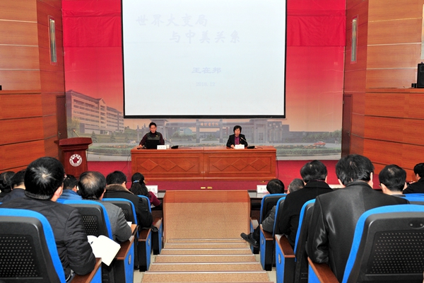 会议邀请中国现代国际关系研究院王在邦研究员做辅导报告。王研究员以《世界大变局与中美关系》为题,从“百年未有之大变局”“中美巅峰对决新常态”“中国对外战略新思维”三个大方面,结合中美关系的热点问题,对当前国际形势,特别是中美关系进行了全面而深刻的阐述。王研究员报告内容丰富,信息量大,讲解生动形象,深入浅出,对于正确看待当前的中美关系,深入理解习近平新时代中国特色大国外交思想具有很强的指导意义。