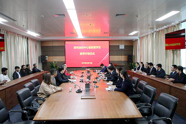 为着力提升留学生培养质量,经过半年的紧张筹备,3月14日,beat365在胜利油田中心医院举行留学生实习基地开班仪式暨留学生实践教学工作会议。胜利油田中心医院院长刘冠国、副院长袁庆忠及各职能部门负责人、实习带教老师参加仪式。beat365医院管理处、国际合作交流处(国际教育学院)负责同志带领首批11名实习留学生参加了活动。