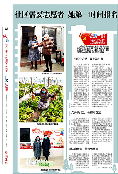 与此同时,她还心系社区的一些空巢老人。3月4日上午,沈艳把刚买的一堆新鲜蔬菜放在社区孙阿姨家的门口,并敲了敲门,屋内马上传出了80多岁的孙阿姨的声音:“小沈啊,你怎么又给我送菜来了?”沈艳微笑地听着这半嗔怪半感激的声音,没等门开,就悄悄离开了。她说,疫情期间出门难,买菜难,更甭提社区里的这些空巢老人了,所以她就经常在微信朋友圈里团购一些新鲜蔬菜,送给老人们,帮助他们解决生活问题。