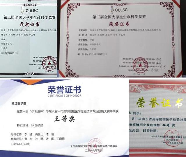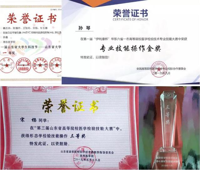 作为新时代新青年,入学以来,同学们深知学习的重要性,在互相学习中,取得了丰硕的成绩。班级综测遥遥领先,连续3年班级综测年级第一,学习成绩年级第一。班级同学积极投身科研,提高科技创新能力。三年间,2名同学参与国家级大学生科技创新基金项目——耻垢分枝杆菌靶向递送/自噬激活结核治疗性疫苗研究,且已成功结题;1名同学负责省级大学生科技创新基金项目——肠球菌生物膜形成能力、毒力基因和耐药性相关性基因,已成功结题;1人获第一届“伊利康杯”华东六省一市高等院校医学检验技术专业技能大赛专业技能操作第一名、团体三等奖;1人荣获第三届山东省高等院校医学检验技能大赛二等奖、三等奖,第十一届山东省大学生科技节—山东省大学生生物大赛一等奖,第三届全国大学生生命科学竞赛三等奖;3人获得潍坊医学院医学检验第七届实验技能大赛三等奖;2人分别获得第潍坊医学院医学检验第九届检验实验技能大赛中一等奖和二等奖;1人获智创·敏行创新创业大赛入围项目奖;2人获潍坊医学院第四届计算机应用设计技能竞赛一等奖和二等奖;班级同学在学术期刊发表学术论文5篇。