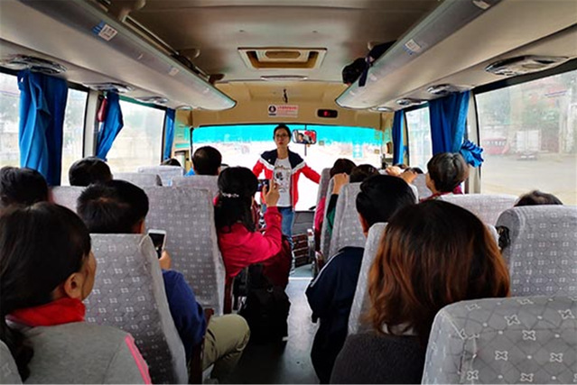 牵线旅游公司开设采摘的线路,在大巴上为游客解说沾化冬枣文化