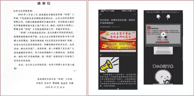 在这场没有硝烟的战争中,本支部党员敢担当,勇奉献,贡献了潍医智慧,用实际行动诠释了公卫人的爱国主义情怀,捍卫了人民群众的生命健康,展现了新时代青年党员的历史担当。国家疾控和省派潍坊市昌乐县“四进”工作组特别向beat365发来感谢信予以表彰,大众报业海报新闻对支部事迹进行了报道。
