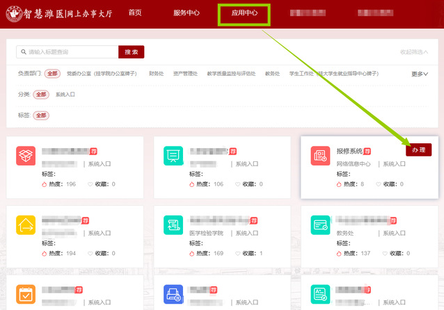 2.电脑端:使用智慧校园进行访问。校内用户点击使用学校官网右上角“智慧校园”,校外用户点击使用学校官网左下角“VPN”→登录智慧校园账号→找到“应用中心”→点击“报修系统”→点击“办理”(随手拍修)。用户操作手册详见附件。