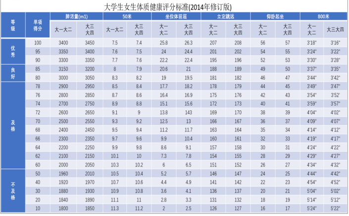 大学生体质健康测试评分标准