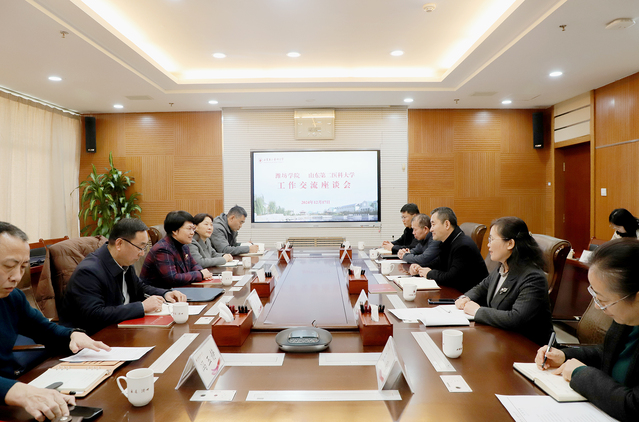 张忠对赵卫红一行表示欢迎,并简要介绍了学校发展基本情况,希望以本次交流为契机,加强沟通合作,互学互鉴,共同发展。赵卫红对学校成功更名表示祝贺,介绍了潍坊学院相关情况。双方围绕财务工作、食堂管理、后勤服务等工作,进行了深入交流。