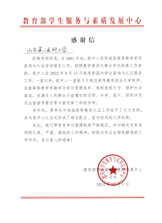 近日,学校收到教育部学生服务与素质发展中心的感谢信,向学校给予高等教育认证工作的大力支持表达感谢,对学校严格规范的管理制度表示赞赏,对积极为毕业生排忧解难的工作作风给予肯定。