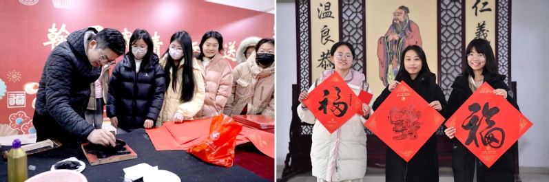“将宣纸覆盖在要拓印的物体上,用拓包蘸取墨汁,均匀地在宣纸表面轻轻敲打,随着一次次拓印,精美的福字拓印作品呈现出来......”“拓福,探寻非遗拓印香” 环节中,人文艺术教育中心老师细致地向大家讲解拓福的历史渊源,现场示范教学拓福的制作方法。“山二医的祝福” 运用了国家级非遗项目 “杨家埠木版年画” 的刻版工艺,巧妙地将校训、学校精神以及标志性建筑等元素镌刻进 “福” 字里,师生们在现场有序地体验了非遗拓印文化,感受传统技艺的独特魅力。