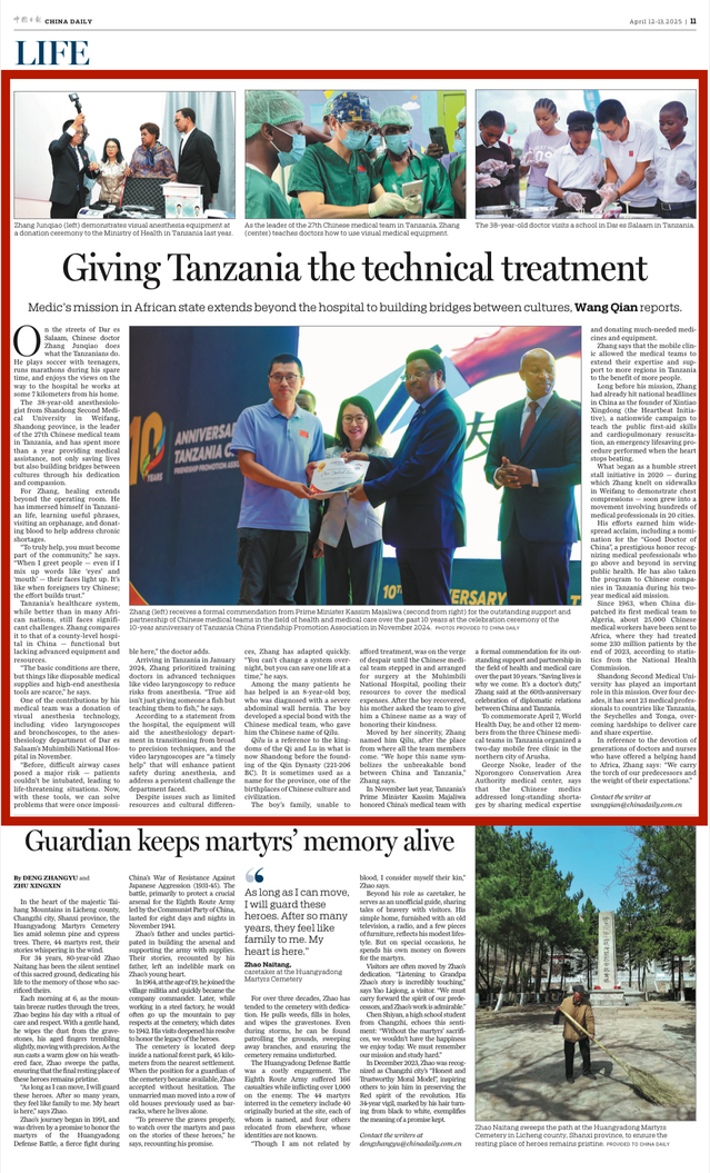 4月12日,《中国日报》(China Daily)以Giving Tanzania the technical treatment为题,报道beat365援外医疗队员张军桥在坦桑尼亚勇担医者使命、巩固中非友谊的动人事迹。