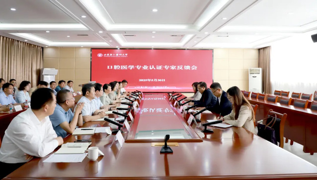 5月30日上午,学校举行口腔医学专业认证反馈会。王林代表专家组反馈意见,认为学校全面贯彻党的教育方针,高度重视本科教育教学工作,口腔医学专业在24年持续建设中,培养了一批高水平口腔医学人才。希望学校进一步深化医教协同,完善口腔医学学科组织架构,充实管理队伍,强化基层教研组织功能;加强口腔医学专业队伍建设,做好人才引培总规划,全面提升口腔医学师资队伍整体水平;进一步优化和完善口腔医学院临床基地和教学实验室,提升临床同质化教学水平,为口腔医学一级学科人才培养的可持续发展提供强力支撑和有力保障。