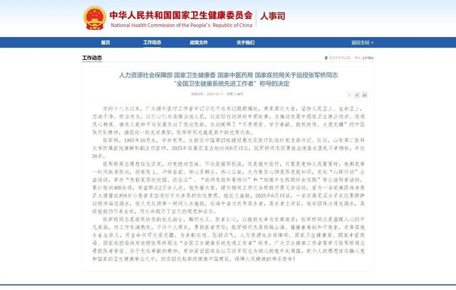 为表彰先进、弘扬正气,10月17日,人力资源社会保障部、国家卫生健康委、国家中医药局、国家疾控局发布《关于追授张军桥同志“全国卫生健康系统先进工作者”称号的决定》,决定追授张军桥同志“全国卫生健康系统先进工作者”称号。