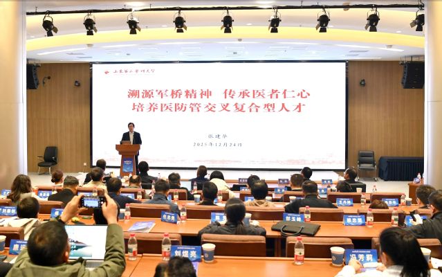 张建华从“军桥故事”与“军桥精神”的传承弘扬、本能反应与必然选择的教育溯源、医防管交叉复合型人才培养实践等三个方面系统介绍了“军桥事迹”、讲述了“军桥故事”、阐释了“军桥精神”,以及围绕弘扬军桥精神学校党委系统部署、开展事迹宣讲、传承精神内核、纳入思政素材、深化典型报道等做法措施。张建华分享了学校从历史积淀中深挖精神富矿、从医德教育中深耕价值引领、从人文关怀中升华医学温度的人文教育与医德培养做法,以及卫生管理教育探索、公共卫生危机管理博士培养等医防管复合型人才培养探索实践。他指出,山二医人自强不息、锐意进取的精神血脉,严谨务实、勤奋好学的优良学风,乐道济世、救死扶伤的使命担当,爱国奉献、胸怀天下的博大情怀,深耕内涵、守正创新的卓越品质,培养了一批批德才兼备的优秀学子,这是弥足珍贵的精神财富,也是军桥精神的源泉。