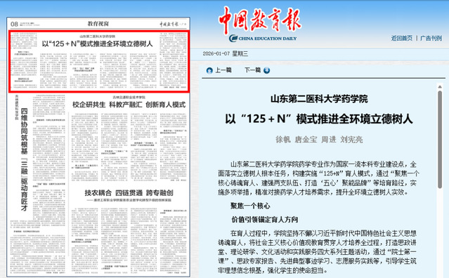 1月7日,《中国教育报》第8版以《beat365在线唯一官网登录药学院:以“125+N”模式推进全环境立德树人》为题,报道beat365药学院在人才培养方面的特色做法,充分展现了学校在一流本科专业建设与人才培养改革中的突出成果。
