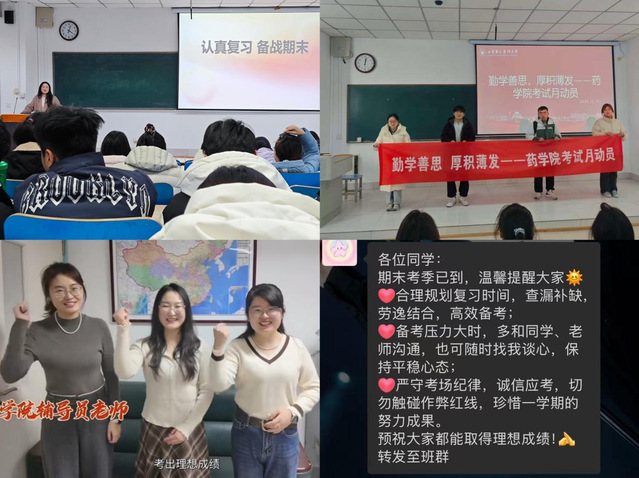 学院线上线下协同发力,筑牢备考保障网:一方面,辅导员化身“备考贴心人”,依托班级群推送考试安排、备考要点等温馨提醒,制作励志加油视频为学子注入奋进力量;另一方面,组织线下期末考试动员会,为同学们答疑解惑、梳理思路。同时,学院印发《药学院考试月应考倡议书》,围绕“明制度、定计划、守诚信、调心态”四大维度,引导同学们合理规划作息、主动调适心态,并鼓励向导师及朋辈求助,以良好状态应考。
