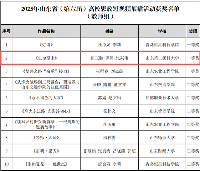 《铭史承志吾辈自强》(临床医学院王郭婷、高伟、王凡、刘刚)、《烽火映初心精神照前路》(药学院金书宇)获教师组优秀奖;《山二医青年说:解码潍县红色故事》(医学影像学院王怡,指导教师陈晓云、赵梦)获学生组潍坊市分赛区一等奖、学生组三等奖,《追寻红色足迹传承沂蒙精神》(团委王艺翔、毕崇宇、李婧涵,指导教师孙文彩、王雅妮)获学生组优秀奖;陈晓云、赵梦获优秀指导教师。这些作品分别从红色传承、医者使命、民生关怀、地方红色故事解读等不同维度发力创作,每一部都凝聚着师生的心血与巧思,既扎根红色沃土挖掘思政内涵,又立足医学专业彰显办学特色,让思政教育与医学教育同频共振、深度融合。