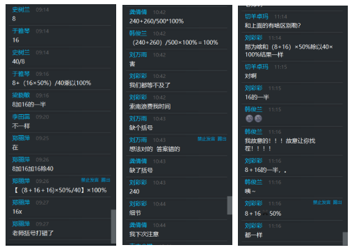在线上课程直播中根据授课进度情况,要求学生将公式或答案提交到讨论区,在发现答案多零或少零之类的情况时,会及时提醒学生自己找问题,其他同学会热心地帮助这个同学找到原因。在课堂中设置“找茬”环节,学生能够很敏锐地找到错误,并在课堂中保持“找茬”的习惯,及时发现自己或者其他同学出现的问题。